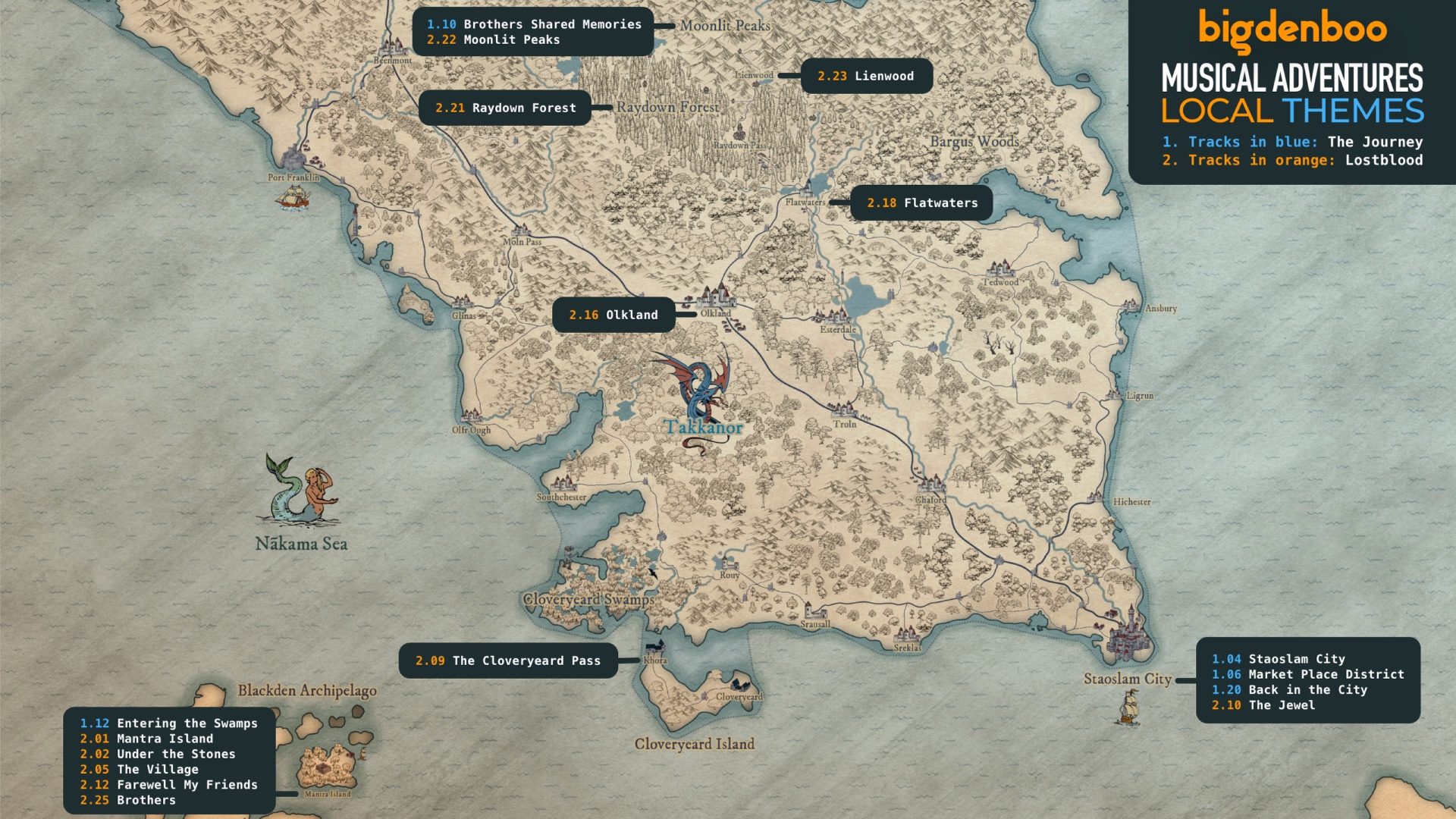 The musical adventures are set in the world of Fãlherilh, a universe entirely imagined to serve as their stage. A large part of the events recounted in the 3 first chapters takes place in the republic of Takkanor and its surroundings.