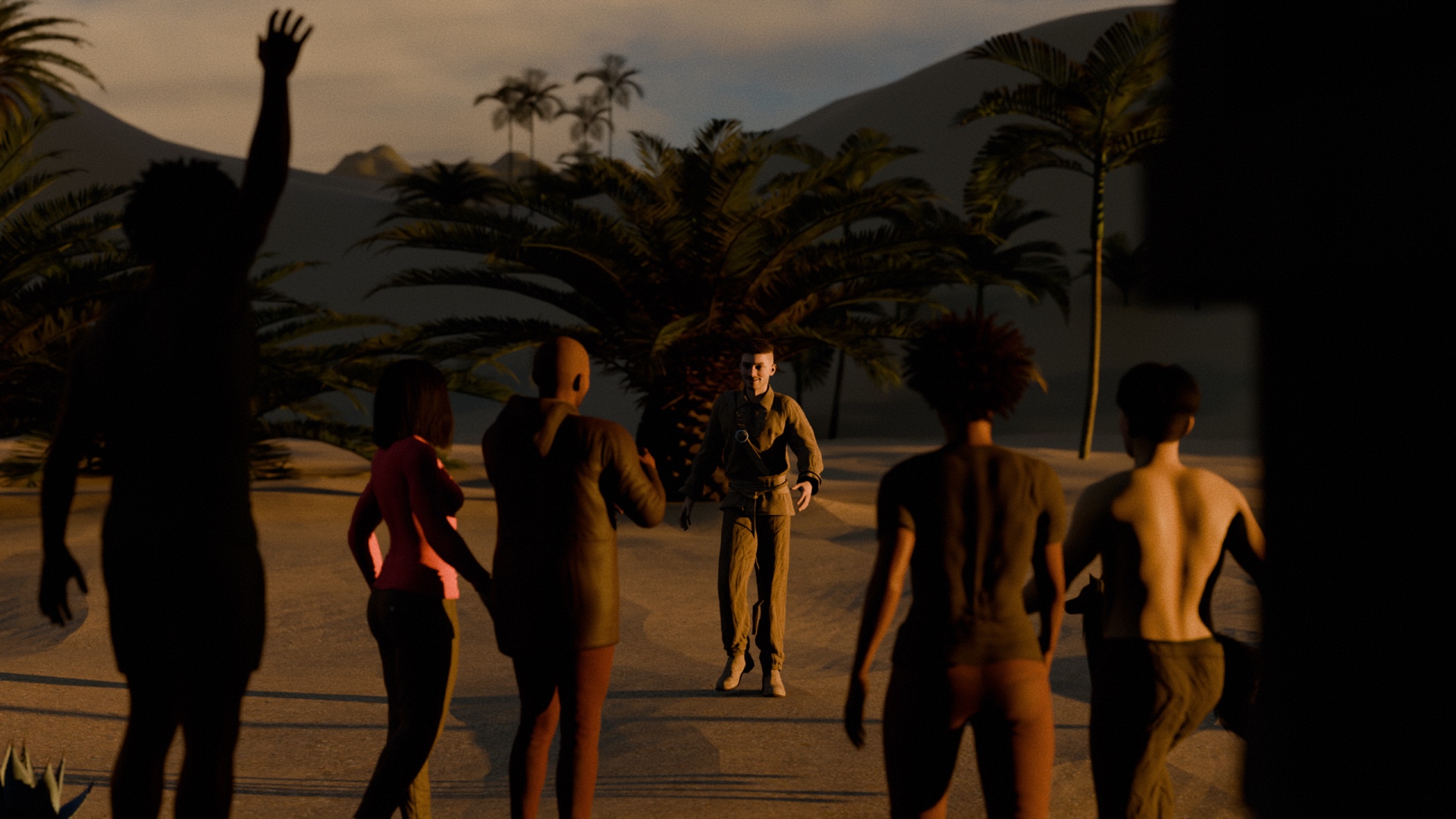 Au pied de l’immense dune de sable, Tyler découvre un village composé d’une poignée de constructions faites principalement de bois.